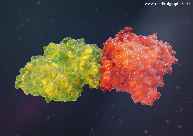Illustration der Acetylcholinesterase. Der Neurotransmitter Acetylcholin wird verwendet, um ein Signal von Nervenzellen zu Muskelzellen zu transportieren. Um das Signal zu stoppen, nachdem es übertragen wurde, muss Acetylcholin zerstört werden. Dies ist die Aufgabe der Acetylcholinesterase, welches sich in der Synapse zwischen Nerven- und Muskelzellen befindet. Acetylcholinesterase spaltet Acetylcholin in etwa 80 Mikrosekunden in zwei inaktive Teile (Essigsäure und Cholin) und stoppt damit weitere Signale. Diese Teile können später wieder zu Acetylcholin zusammengesetzt werden. Diese Abbildung basiert auf Strukturdaten von Sussman, J.L., Harel, M., Silman, I.