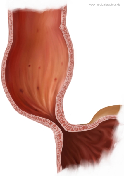Illustration einer Ösophagusachalasie. Magen und Speiseröhre sind in Frontalebene geschnitten. Der untere Ösophagussphinkter ist nicht mehr in der Lage seine Muskulatur zu lockern. Hierdurch ist der Transport der Nahrung von der Speiseröhre in den Magen gestört.
