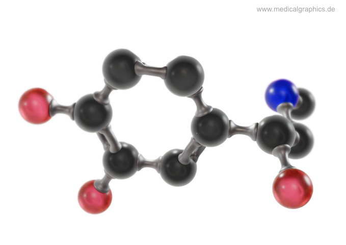 Illustration von Adrenalin (Epinephrin) in einer 3D Darstellung als Kugel-Stab-Modell auf weißem Hintergrund. Adrenalin ist ein im Nebennierenmark gebildetes Hormon, das im Zentralnervensystem auch als Neurotransmitter fungiert. Als (Stress-)Hormon steigert Adrenalin die Herzfrequenz, erhöht den Blutdruck durch ein Zusammenziehen der Blutgefäße, es weitet die Bronchiolen und setzt Zucker aus der Leber frei, um Muskeln schneller mit Energie zu versorgen.