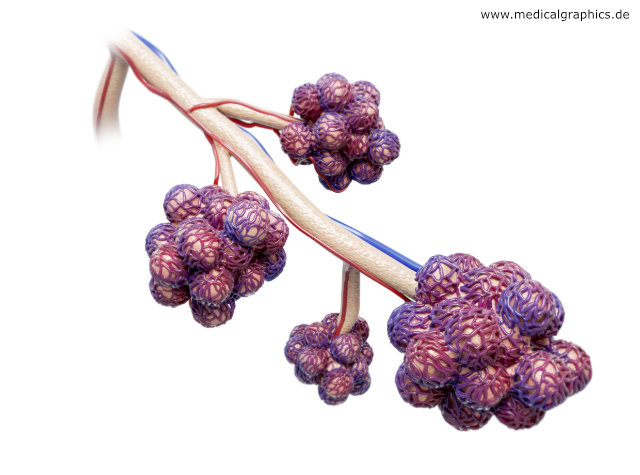 Illustration von Alveolen (Lungenbläschen) und Bronchien. In den Lungenbläschen findet bei der Atmung der Austausch von Sauerstoff und CO2 zwischen Blut und Atemluft statt. Diese ca. 300 Millionen kugelartigen Ausstülpungen vergrößern die Oberfläche der Lunge, wo der Gasaustausch stattfindet, auf 100 bis 140 Quadratmeter.
