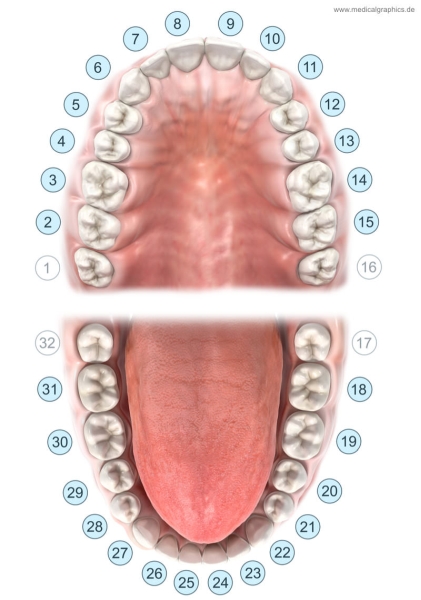 Ober- und Unterkiefer mit Nummerierung der Zähne nach amerikanischem Zahnschema (Universal Numbering System).
