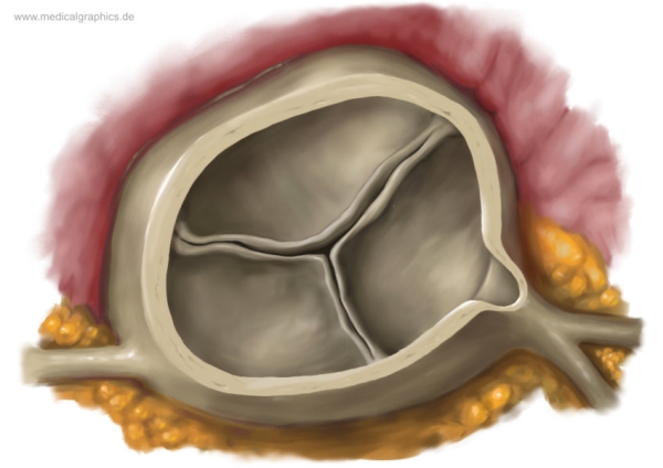 Illustration einer gesunden, geschlossenen Aortenklappe (Valva aortae) von Kranial. Andeutung des umgebenden Gewebes. Ein Teil der aufsteigenden Aorta (Aortenwurzel) wird noch als Stumpf angedeutet, um den Abgang der rechten und linken Koronararterien zu zeigen.