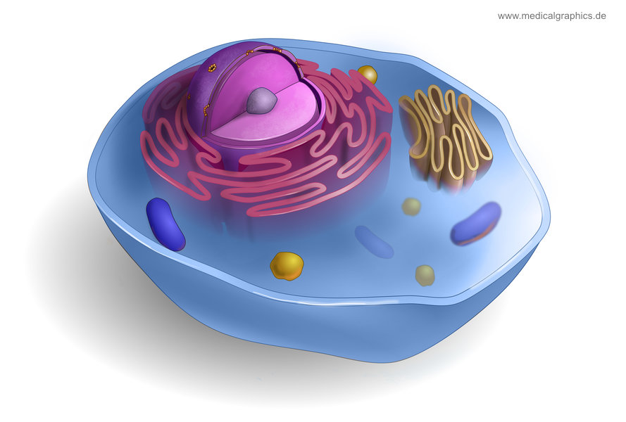 Medizinische Grafik zum Aufbau und den Strukturen der Zelle. Der Schnitt durch den Zellkörper ermöglicht einen Blick auf die Zellorganellen.
