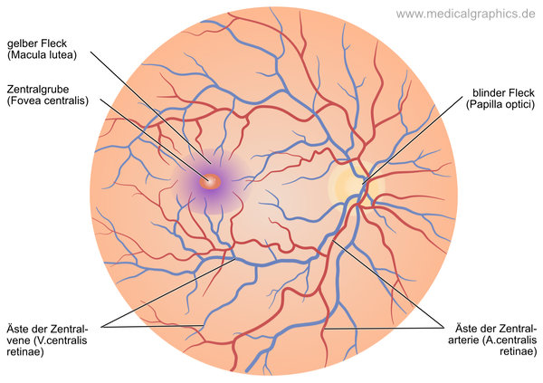 Illustration des Augenhintergrundes (Fundus oculi) mit Netzhaut (Retina), Sehnervkopf (Blinder Fleck), Blutgefäßen (Arteria und Vena centralis retinä) und dem Gelben Fleck (Macula lutea).