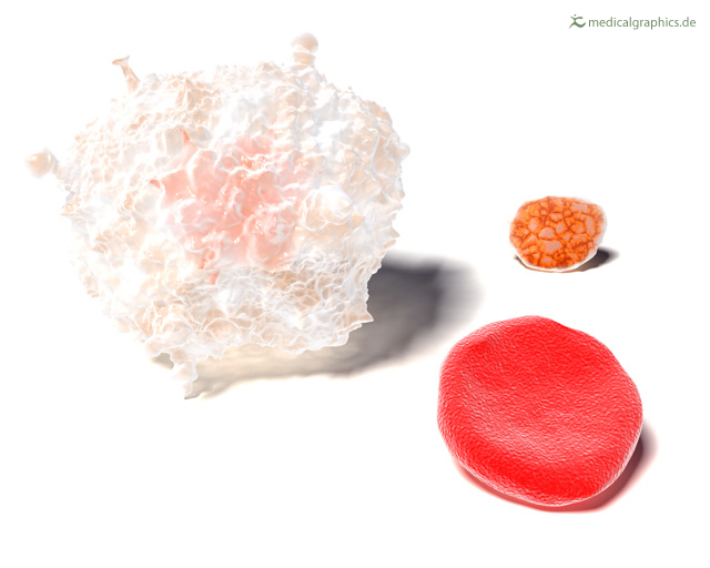 Die Illustration zeigt Leukozyten (weiße Blutkörperchen), Erythrozyten (rote Blutkörperchen) und Thrombozyten (Blutplättchen).
