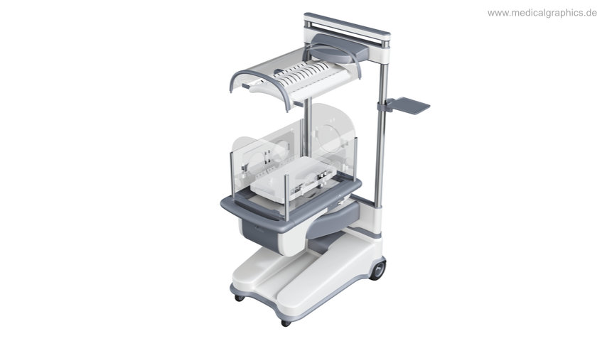 Illustration eines geöffneten Brutkastens zur Pflege von Frühgeborenen und schwer erkrankten Neugeborenen. Das Gerät ermöglicht unter anderem die Sauerstoffzufuhr, Überwachung der Vitalfunktionen und den Schutz vor Kälte und Infektionen des Neugeborenen.