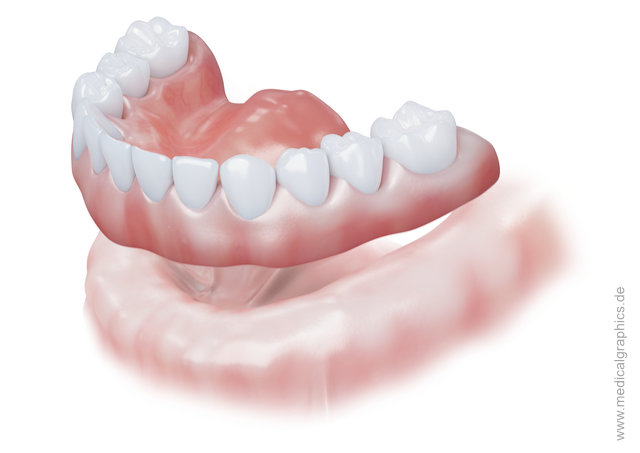 Illustration einer dentalen Vollprothese (künstliches Gebiss) des Unterkiefers.