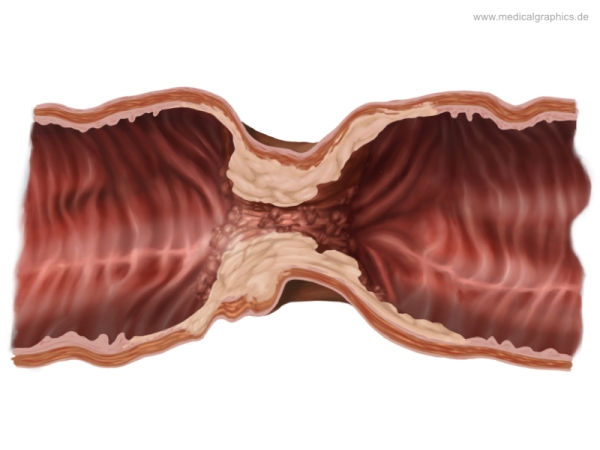 Illustration eines einschnürenden Adenokarzinom des Colon transversum (Querkolon). Dieser bösartige (maligne) Tumor schnürt das Lumen des Darmabschnitts ein.