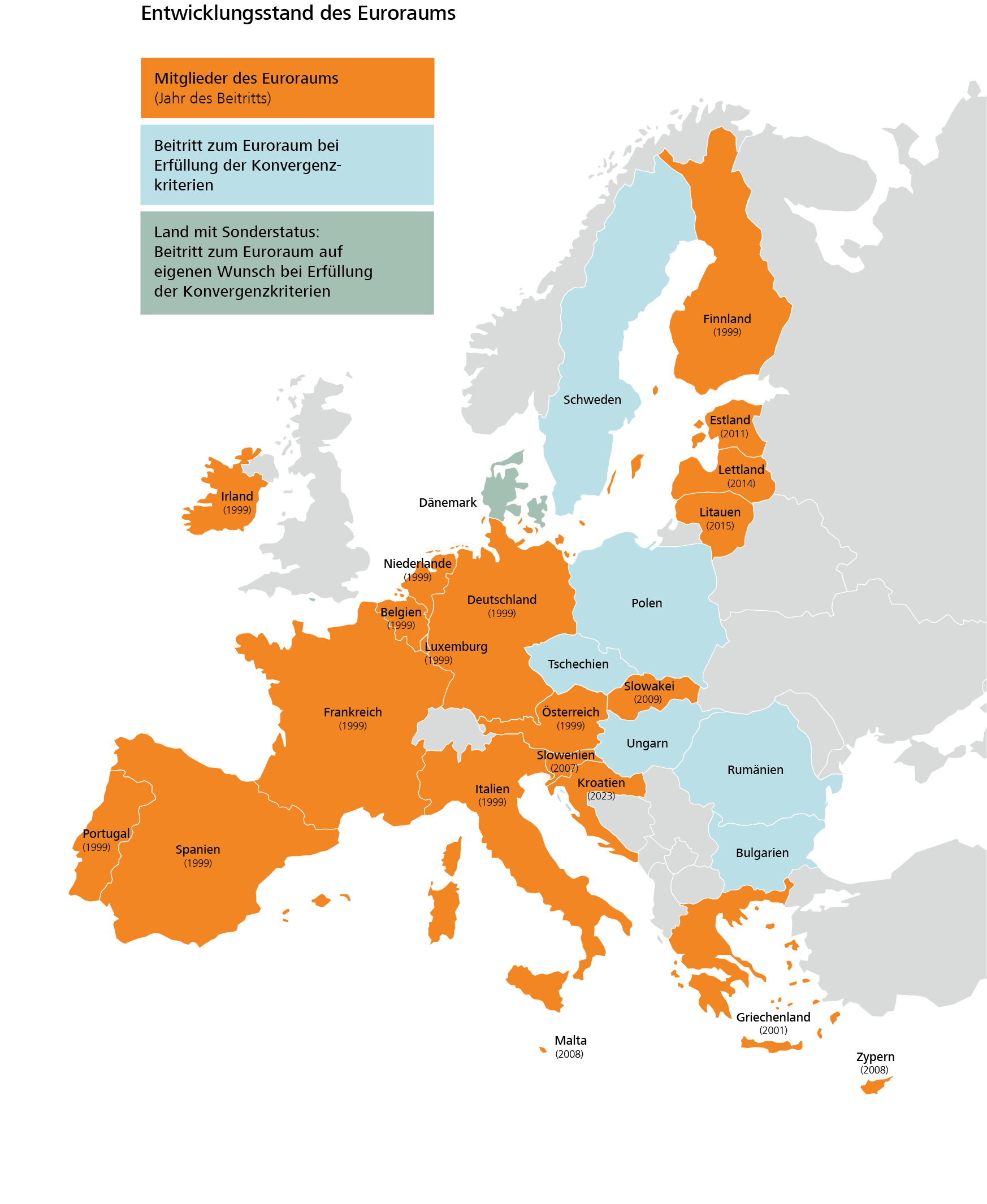 Von den 28 EU-Ländern gehören dem Euro-Währungsgebiet heute 20 Länder an: Belgien, Deutschland, Finnland, Frankreich, Irland, Italien, Luxemburg, Niederlande, Österreich, Portugal, Spanien, Griechenland, Slowenien, Malta und Zypern, Slowakei, Estland, Lettland, Litauen und Kroatien. Die EU-Staaten, die den Euro noch nicht als gemeinsame Währung eingeführt haben, sind grundsätzlich verpflichtet, dem Euro-Währungsgebiet beizutreten, sobald sie die Konvergenzkriterien erfüllen. Eine Ausnahme bildet Dänemark, das eine Sonderstellung ("Opting-out-Klausel") ausgehandelt hat. Es können selbst entscheiden, ob es den Euro als Währung übernehmen, sofern es die Konvergenzkriterien erfüllt. Auch Großbritannien hatte früher diese Opting-out-Klausel; mit dem Ausstieg Großbritanniens aus der EU (Brexit) spielen diese Überlegungen aber keine Rolle mehr.