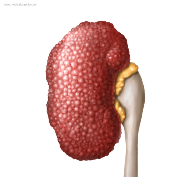 Illustration von Veränderungen der Niere bei einer seit langem bestehende essentielle Hypertonie. Starke Granulierung der Nierenoberfläche. Stark geschrumpfte Niere.