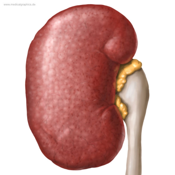 Illustration von Veränderungen der Niere bei einer essentiellen Hypertonie nach kurzer Dauer. Leichte Granulierung der Nierenoberfläche.