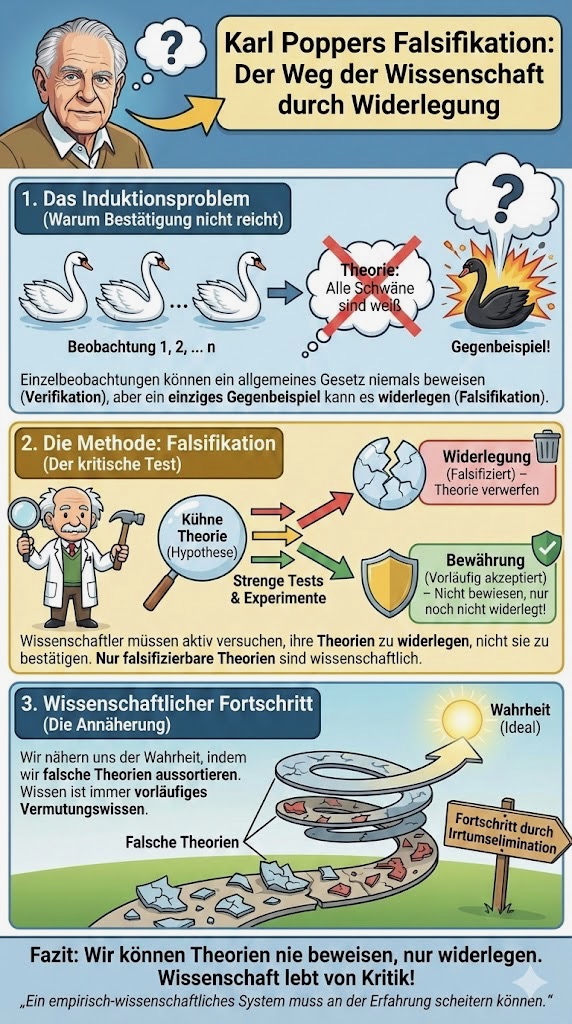 Dies ist ein KI-generiertes Schema zu Karl Poppers Falsifikationsprinzip.