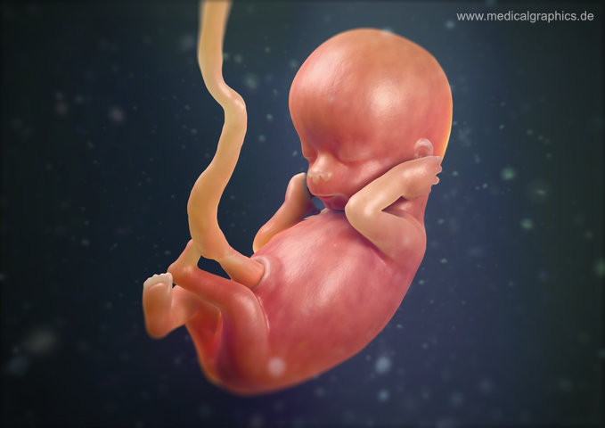 Illustration eines Fötus in der 12. Schwangerschaftswoche auf dunklem Hintergrund.