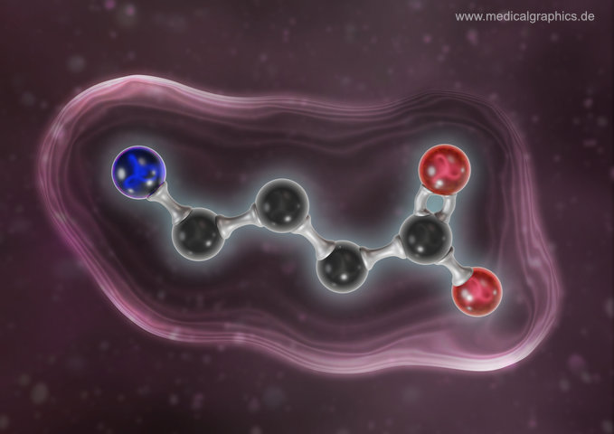 Illustration von Gamma-Aminobuttersäure (GABA) als Kugel-Stab-Modell mit angedeutetem Oberflächenmodell auf rotem Hintergrund. GABA ist der hauptsächliche Neurotransmitter von inhibitorischen (hemmenden) Synapsen im Gehirn und beteiligt an der Steuerung des Schlaf-Wach-Rhythmus und der Bildung von Wachstumshormonen. Zudem hat Gamma-Aminobuttersäure eine beruhigende Wirkung und kann als körpereigenes Anti-Stress-Mittel bezeichnet werden.