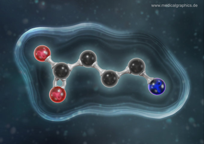 Illustration von Gamma-Aminobuttersäure (GABA) als Kugel-Stab-Modell mit angedeutetem Oberflächenmodell auf türkisem Hintergrund. GABA ist der hauptsächliche Neurotransmitter von inhibitorischen (hemmenden) Synapsen im Gehirn und beteiligt an der Steuerung des Schlaf-Wach-Rhythmus und der Bildung von Wachstumshormonen. Zudem hat Gamma-Aminobuttersäure eine beruhigende Wirkung und kann als körpereigenes Anti-Stress-Mittel bezeichnet werden.