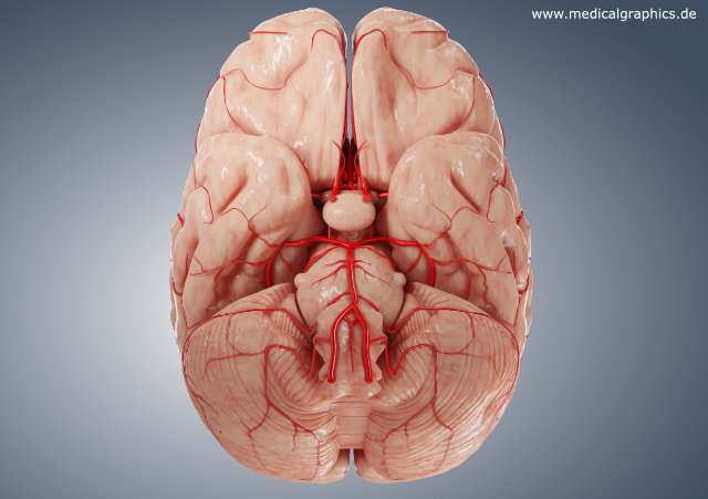 Illustration eines menschlichen Gehirns mit Arterien von schräg-unten. Im Bildmittelpunkt steht der Hirnstamm und das Kleinhirn mit den Gefäßen.