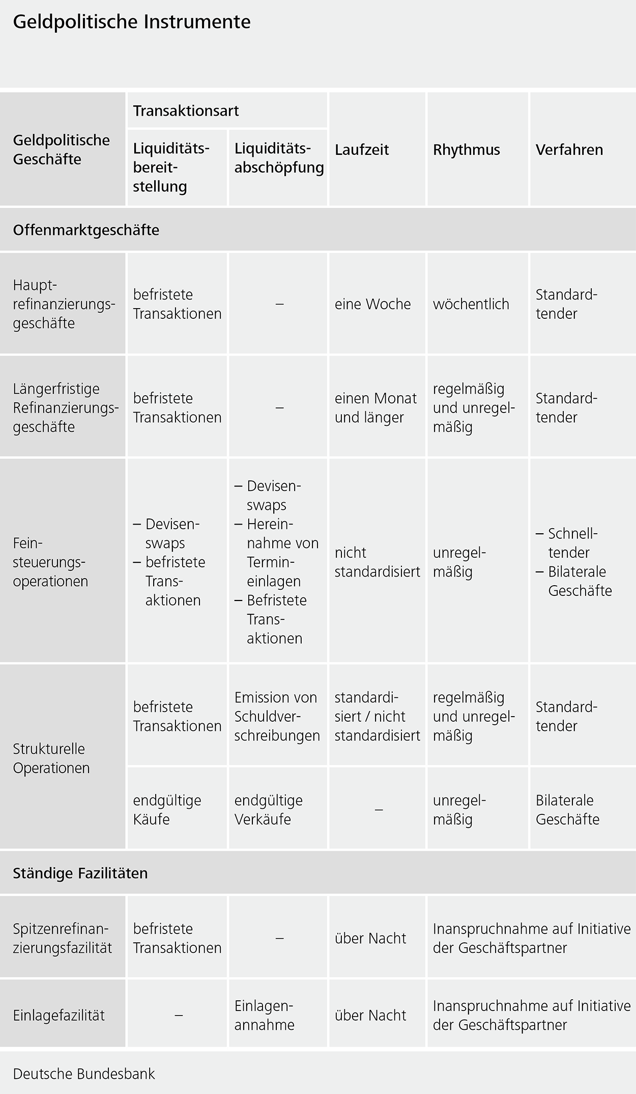 Diese Datei enthält eine Aufstellung der geldpolitischen Instrumente. Je nach geldpolitischem Geschäft werden Transaktionsart, Laufzeit, Rhythmus und Verfahren angegeben. Die Infografik ist dem Buch "Geld- und Geldpolitik" entnommen. Sie steht im PNG-Format zur Verfügung, wodurch sie in viele Dokumentformate eingefügt werden kann.