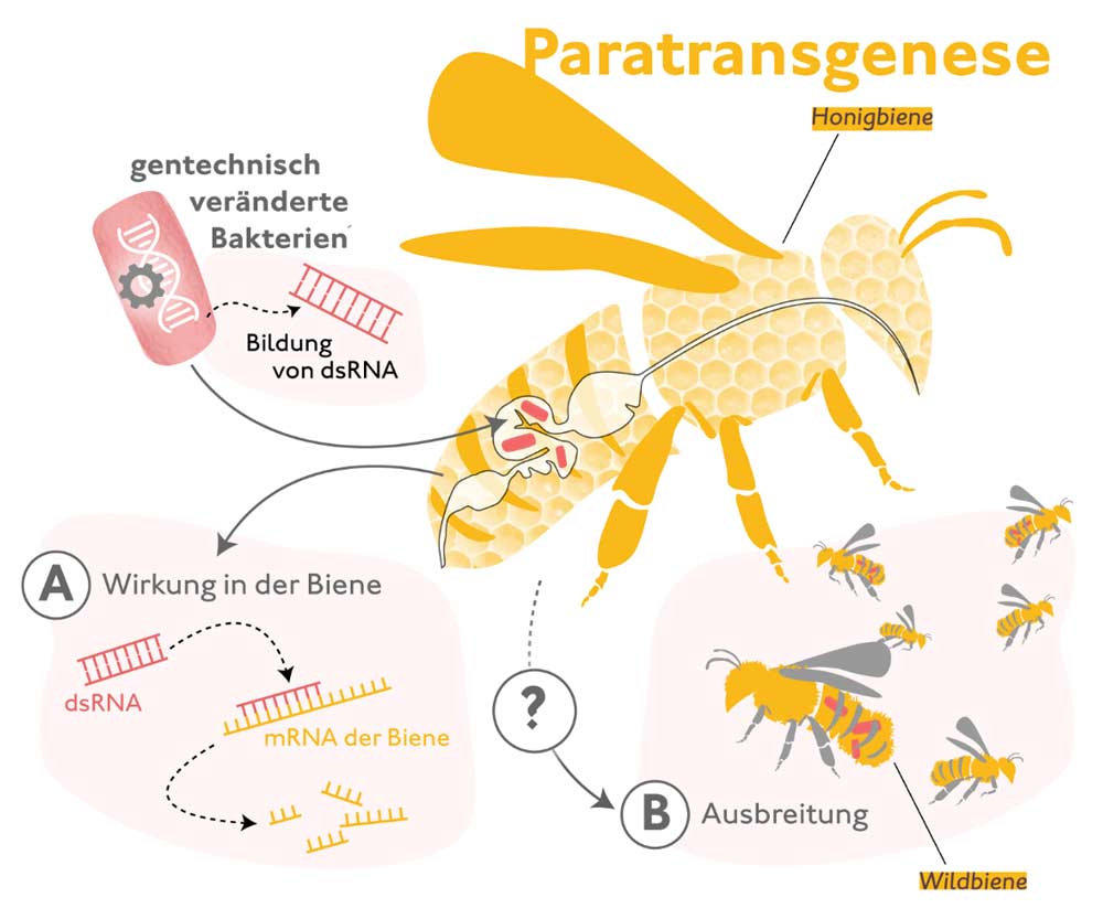 Bakterien, die natürlich im Darm von Bienen und Hummeln vorkommen, wurden gentechnisch so verändert (oben links), dass sie einen besonderen Gen-Botenstoff produzieren. Das ist eine spezifische, sogenannte doppelsträngige Ribonukleinsäure, kurz dsRNA. (A) Wenn sich die Bakterien im Darm der Bienen angesiedelt haben, gelangt ihr Gen-Botenstoff in jede Zelle der Biene und greift dort in die Genregulation ein.* So sollen bestimmte Eigenschaften der Insekten beeinflusst werden, z.B. ihr Fressverhalten. Gen-Botenstoffe vom Typ dsRNA können auch dazu verwendet werden, Parasiten wie z.B. Milben abzuwehren; auch hier würde in die Genregulation eingegriffen. Das indirekte Manipulieren von Zielorganismen durch Eingreifen in ihre Genregulation nennt man Paratransgenese. (B) Da die Bakterien auch in anderen Wildbienenarten wie z.B. Hummeln natürlich vorkommen, könnten sich die gentechnisch veränderten Bakterien auch in ihnen einnisten und unkontrolliert verbreiten. Die hier beschriebene Anwendung mit dem Gen-Botenstoff wurde bisher nur im Labor erprobt, es gibt noch keine Zulassung.