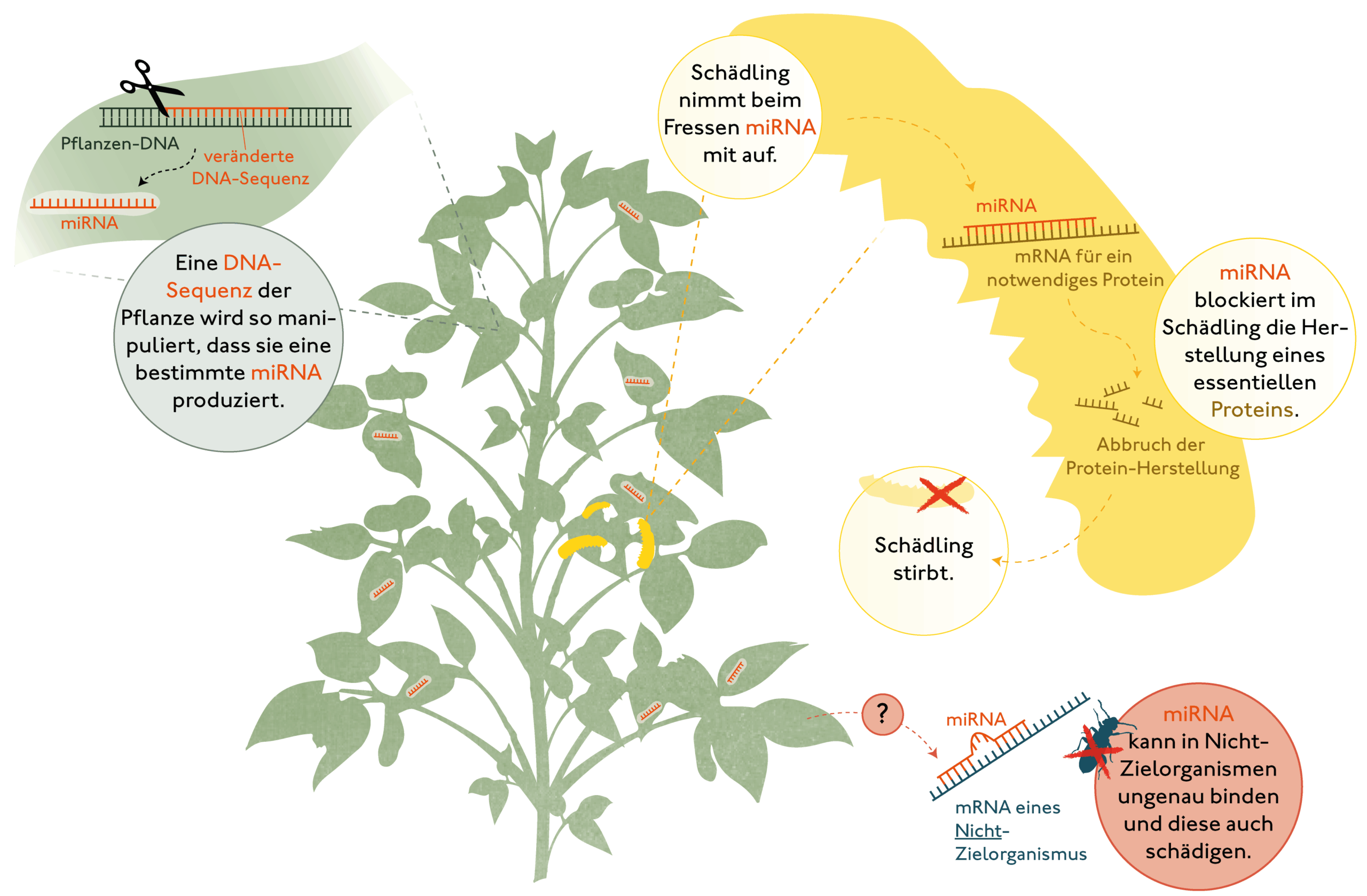 Gentechnisch veränderte Pflanzen: Insektengiftig durch den RNAi-Wirkmechanismus | Um Pflanzenschädlinge zu bekämpfen, können Pflanzen durch den Einsatz Neuer Gentechniken mit dem RNAi (RNA-Interferenz)-Wirkmechanismus ausgestattet werden. Das Vorbild sind natürliche RNA-Interferenzen, die die Genaktivität in Pflanzen und Tieren regeln. In diesem Fall wird eine DNA-Sequenz gentechnisch so verändert, dass sie eine bestimmte miRNA (micro RNA) herstellt, die giftig für einen Schädling ist, zum Beispiel eine blattfressende Raupe. Frisst die Raupe an dieser Pflanze, so nimmt sie die miRNA mit auf. Die spezielle miRNA kann dann in den Raupenzellen in die Genregulation eingreifen und die Produktion essentieller Stoffe vermindern oder ganz blockieren. Der Schädling stirbt infolgedessen ab. Den Mechanismus nennt man RNA-Interferenz. Der Einsatz von miRNA gegen Schädlinge hat auch Risiken für z.B. andere Insekten, die keine Schädlinge sind, sogenannte Nicht-Zielorganismen. Nehmen Nicht-Zielorganismen, die auf der gleichen Pflanze leben, die miRNA auf, kann diese auch bei ihnen den RNAi-Mechanismus auslösen und ihre Genregulation stören. Das funktioniert vor allem dann, wenn sich die mRNA von Schädlingen und Nicht-Schädlingen, an die die miRNA binden soll, ähnlich sind.