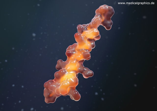 Illustration eines Glukagon Hormons als gläsernes Oberflächenmodell mit angedeuteten, tieferliegenden Bändermodell auf dunklem Hintergrund. Das Peptidhormon Glukagon ist der Gegenspieler des Insulin-Hormons, das auch in der Bauchspeicheldrüse gebildet wird. Glukagon wird freigesetzt sobald der Blutzuckerspiegel zu tief absinkt. Es erhöht den Blutzuckerspiegel indem es die Zuckerreserven der Leber abruft und die Zuckerneubildung anregt. Diese Illustration basiert auf Strukturdaten von Blundell, T.L., Sasaki, K., Dockerill, S., Tickle, I.J.