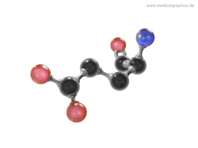 Illustration von Glutamat in einer 3D Darstellung als Kugel-Stab-Modell auf weißem Hintergrund. Glutamat ist eine Form der Glutaminsäure und einer der wichtigsten erregenden Neurotransmitter im zentralen Nervensystem (ZNS). Glutamat spielt eine wichtige Rolle bei Sinneswahrnehmungen, Ausführung von Bewegungen, höheren Gehirnfunktionen und Regulierung des Hungergefühls.