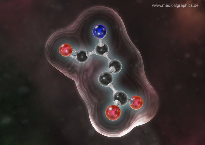 Illustration von Glutamat in einer 3D Darstellung als Kugel-Stab-Modell mit angedeutetem Oberflächenmodell auf rotem Hintergrund. Glutamat ist eine Form der Glutaminsäure und einer der wichtigsten erregenden Neurotransmitter im zentralen Nervensystem (ZNS). Glutamat spielt eine wichtige Rolle bei Sinneswahrnehmungen, Ausführung von Bewegungen, höheren Gehirnfunktionen und Regulierung des Hungergefühls.