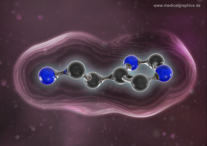 Illustration von Histamin in einer 3D Darstellung als Kugel-Stab-Modell mit angedeutetem Oberflächenmodell auf violettem Hintergrund. Histamin wirkt sowohl als Gewebshormon wie auch als Neurotransmitter. Als Neurotransmitter im zentralen Nervensystem beeinflusst Histamin die Ausschüttung anderer Neurotransmitter, die Auslösung des Erbrechens und die Regulation des Schlaf-Wach-Rhythmus steuern. Histamin spielt eine wichtige Rolle bei der Abwehr körperfremder Stoffe (Immunsystem) aber auch bei Allergien und Asthma. Zudem ist Histamin wesentlich für Entzündungsreaktionen (anschwellen des Gewebes) und bei Verbrennungen involviert.