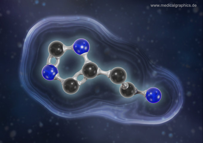 Illustration von Histamin in einer 3D Darstellung als Kugel-Stab-Modell mit angedeutetem Oberflächenmodell auf blauem Hintergrund. Histamin wirkt sowohl als Gewebshormon wie auch als Neurotransmitter. Als Neurotransmitter im zentralen Nervensystem beeinflusst Histamin die Ausschüttung anderer Neurotransmitter, die Auslösung des Erbrechens und die Regulation des Schlaf-Wach-Rhythmus steuern. Histamin spielt eine wichtige Rolle bei der Abwehr körperfremder Stoffe (Immunsystem) aber auch bei Allergien und Asthma. Zudem ist Histamin wesentlich für Entzündungsreaktionen (anschwellen des Gewebes) und bei Verbrennungen involviert.