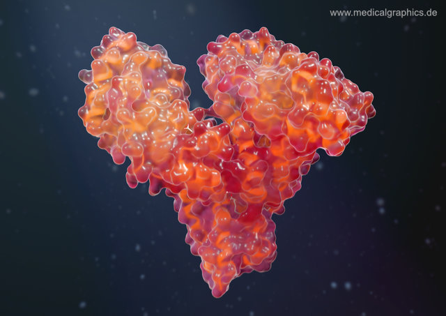 Illustration eines Humanalbumins als gläsernes Oberflächenmodell mit angedeuteten, tieferliegenden Bändermodell auf dunklem Hintergrund. Humanalbumin ist die menschliche Form des Albumins, welches im Blut vorkommt. Albumin wird in der Leber produziert und bindet Wasser in den Blutgefäßen an sich und steuert so den kolloidosmotischen Druck. Bei Schädigung der Leber und reduzierter Synthese von Albumin vermindert sich der onkotische Druck und Ödeme und Aszites können entstehen. Die Illustration basiert auf Strukturdaten von Bhattacharya, A.A., Grune, T., Curry, S.