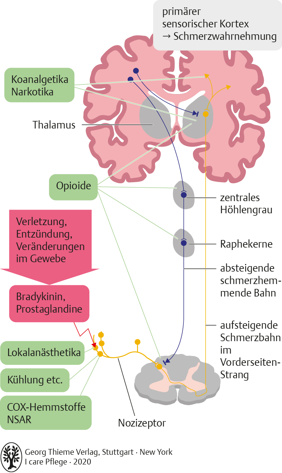 I care Krankheitslehre | Grundlagen | Schmerzentstehung, Schmerzweiterleitung und Wirkorte verschiedener Analgetika (Grafik)