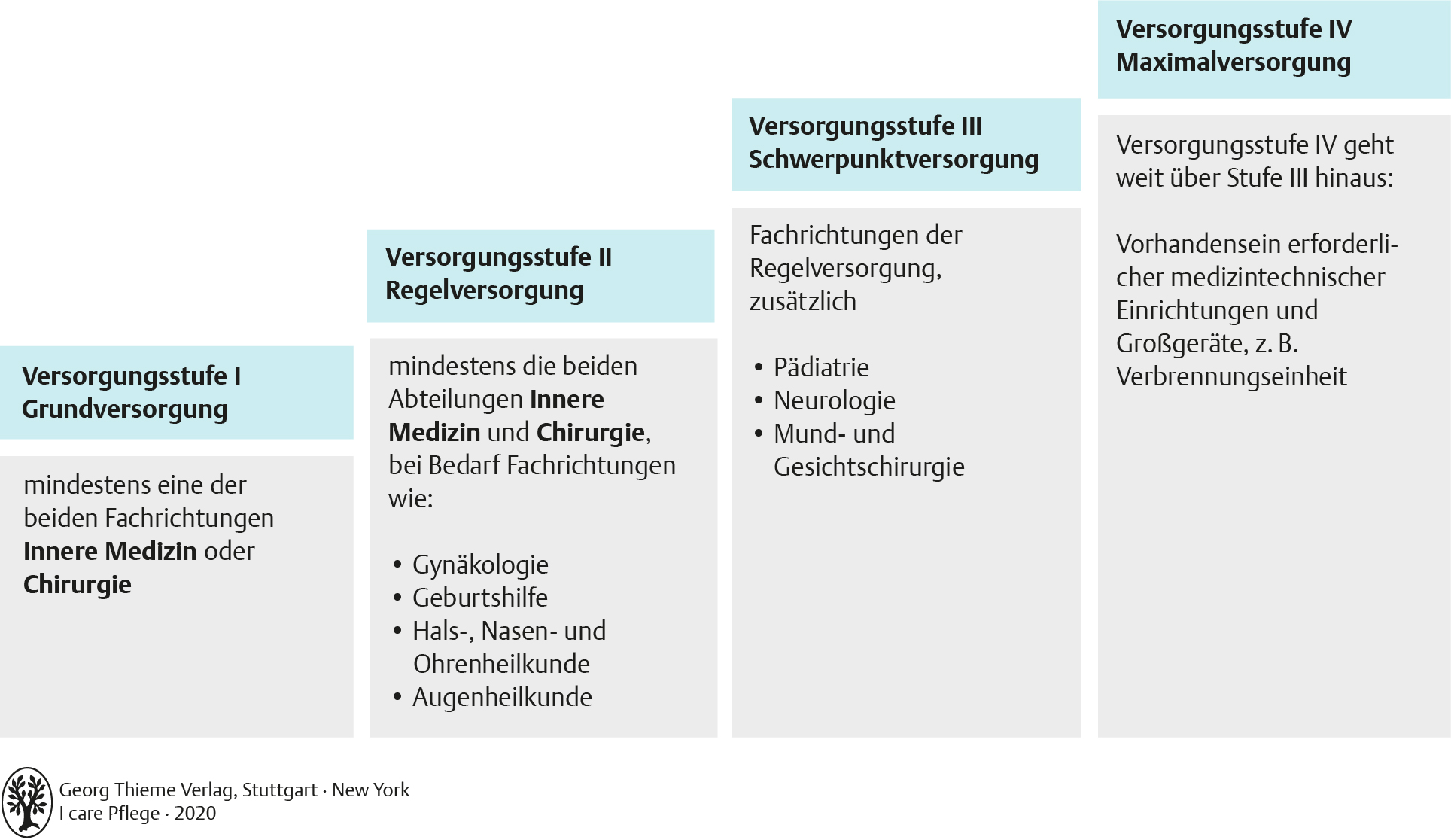 Das Schaubild beschreibt die vier Stufen der Versorgung: Versorgungsstufe I, Grundversorgung / Versorgungsstufe II, Regelversorgung / Versorgungsstufe III, Schwerpunktversorgung / Versorgungsstufe IV, Maximalversorgung.