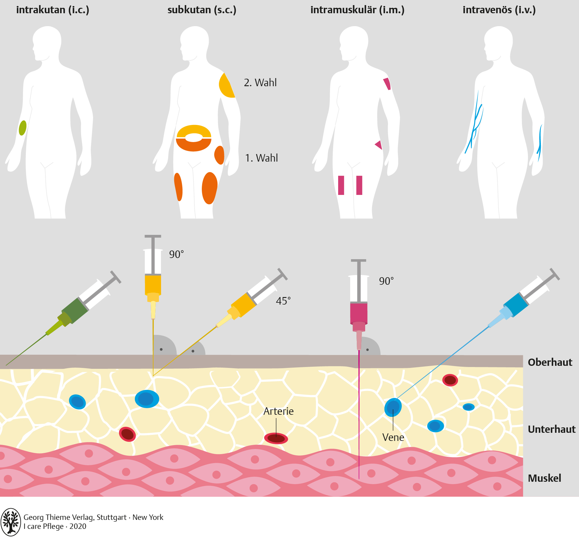Das Schaubild zeigt, an welchen Körperstellen und mit welchem Neigungswinkel der Kanüle die Injektionsarten intrakutan, subkutan, intramuskulär und intravenös durchgeführt werden.