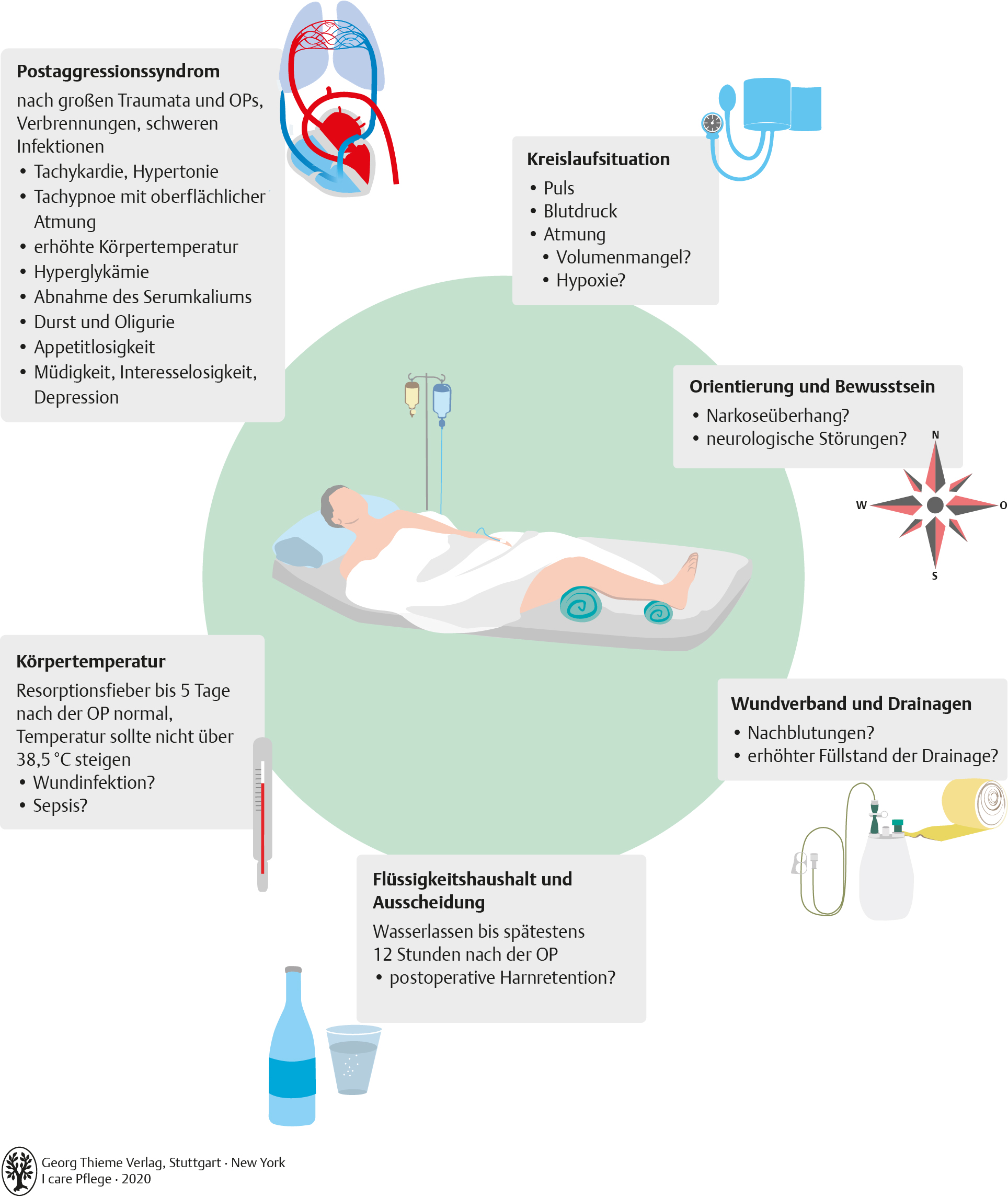 Diese Grafik beschreibt, welche Symptome bei Patienten postoperativ beobachtet bzw. überwacht werden müssen: Postaggressionssyndrom, Körpertemperatur, Kreislauf, Orientierung und Bewusstsein, Wundverband und Drainagen sowie Flüssigkeitshaushalt und Ausscheidung.