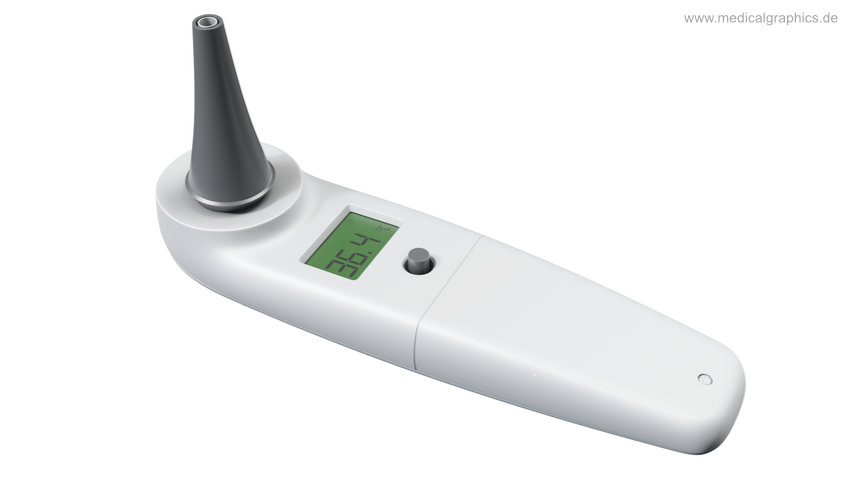 Illustration eines Ohrthermometers zur Messung der Körpertemperatur eines Menschen. Das Thermometer arbeitet mit dem Infrarot-Messprinzip und ermöglicht im Vergleich zu anderen Messmethoden eine sehr kurze, nur wenige Sekunden betragende Messdauer.