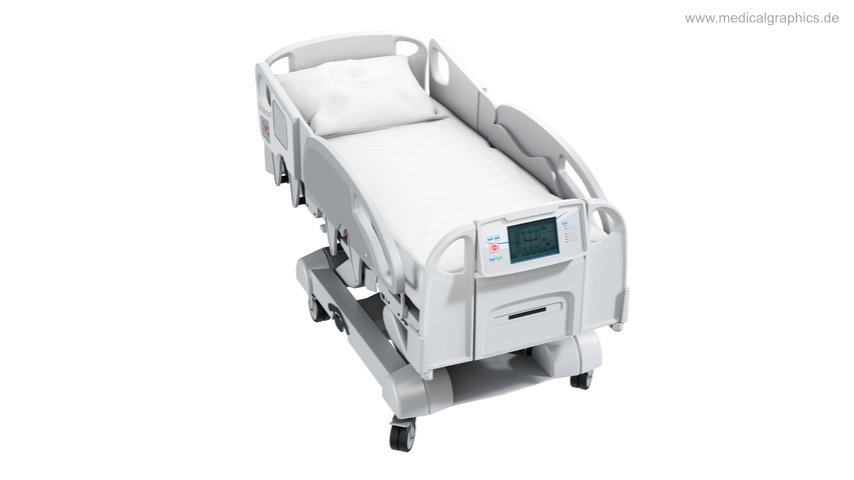 Illustration eines Intensivbetts mit Rädern und einer Bremse, elektrischen Bedienelementen, ein motorisiertes Antriebssystem und absenkbare Seitenteile. Das Kopfteil ist abnehmbar, um Eingriffe wie z. B. Intubation und Gefäßzugänge vom Kopfende des Bettes aus zu ermöglichen. Ein Touchdisplay hilft bei der Überwachung des Intensivpatienten durch das Pflegepersonal.