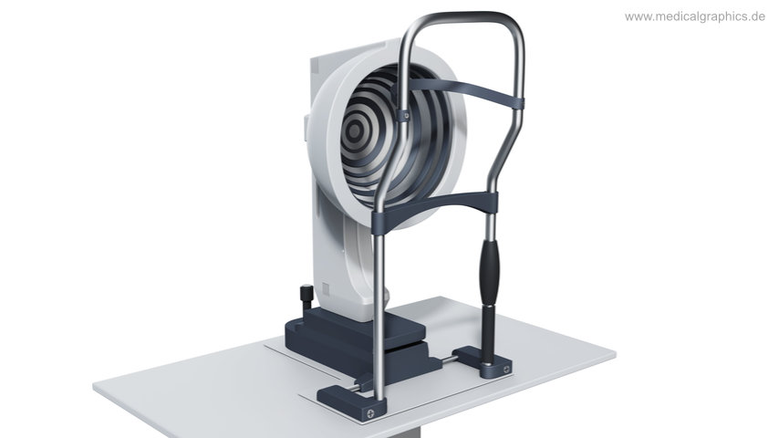 Illustration eines Keratograph (Hornhauttopograph) zur räumlichen Messung der Oberfläche der Hornhaut in einer Nahansicht. Durch die hohe Dichte an Messpunkten (10.000 bis 30.000) kann eine hochauflösende Topografie der Cornea gewonnen werden.