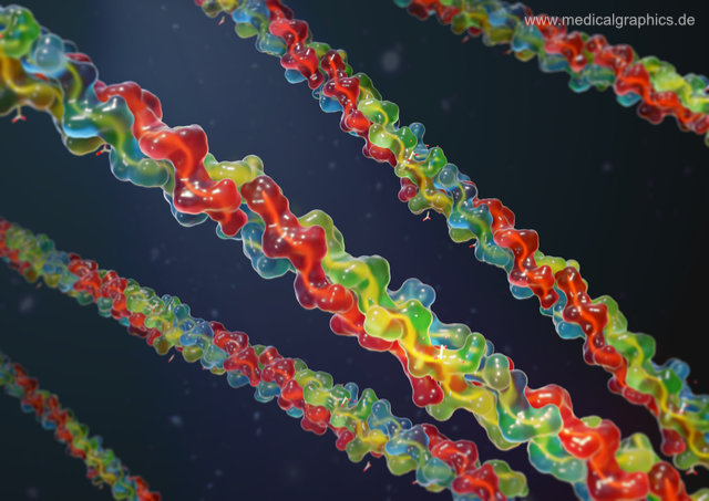 Illustration des Strukturporteins Kollagen als gläsernes Oberflächenmodell mit angedeuteten, tieferliegenden Bändermodell auf dunklem Hintergrund. Kollagene sind eine Gruppe von Strukturproteinen, die sich hauptsächlich im Bindegewebe finden. Einige Schichten der Haut bestehen aus Kollagenen. Sie befinden sich aber auch z. B. in Knochen, Sehnen, Knorpel, Blutgefäßen und Zähnen. Die Illustration basiert auf Strukturdaten von Kramer, R.Z., Bella, J., Mayville, P., Brodsky, B., Berman, H.M.