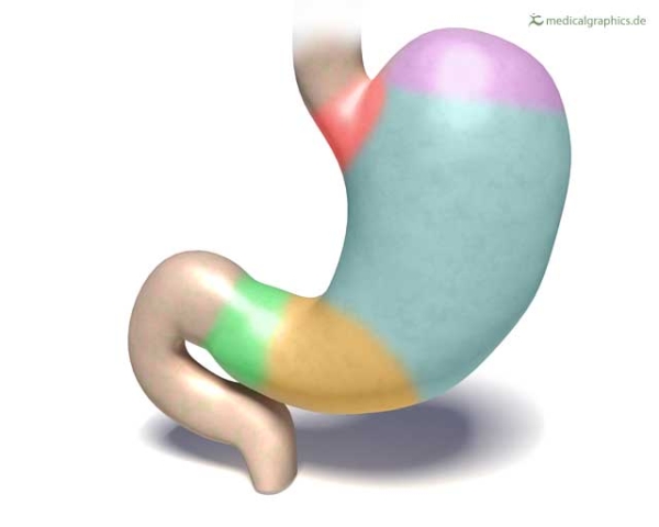Illustration des Magens mit Markierung der anatomischen Regionen.