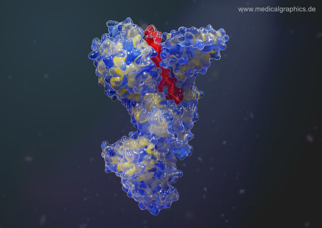 Illustration des Letalfaktors des Bacillus anthracis als gläsernes Oberflächenmodell mit angedeuteten, tieferliegenden Bändermodell auf dunklem Hintergrund. Dieses Protein ist für die Pathogenese von Milzbrand entscheidend, indem es notwendige Signalwege hemmt. Die Protease besteht aus vier Domänen. Die Abbildung basiert auf Strukturdaten von Pannifer, A.D., Wong, T.Y., Schwarzenbacher, R., Renatus, M., Petosa, C., Collier, R.J., Bienkowska, J., Lacy, D.B., Park, S., Leppla, S.H., Hanna, P., Liddington, R.C.