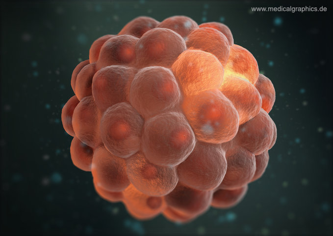 Illustration einer Morula auf dunklem Hintergrund ca. 96 Stunden nach der Befruchtung. Die Morula befindet sich zu diesem Zeitpunkt der Embryogenese in der Regel im Eileiter und eine erste Differenzierung der Zellen beginnt.