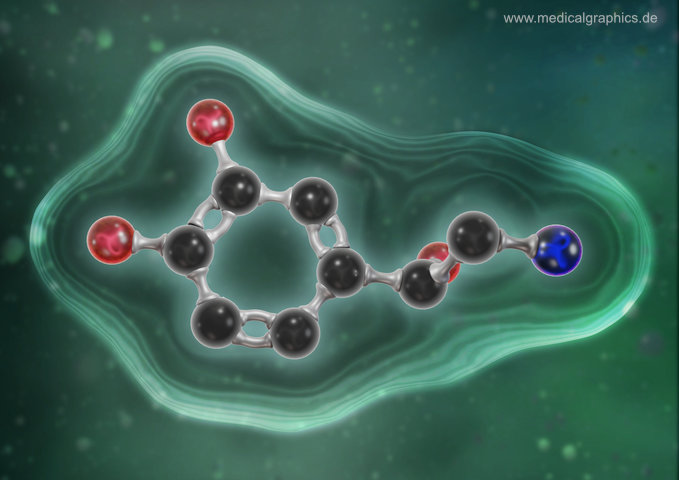 Illustration von Noradrenalin (Norepinephrin) in einer 3D Darstellung als Kugel-Stab-Modell mit angedeutetem Oberflächenmodell auf grünem Hintergrund. Noradrenalin ist ein Botenstoff, der als Stresshormon und Neurotransmitter wirkt. Als Hormon wird Noradrenalin im Inneren der Nebenniere (Nebennierenmark) gebildet, als Neurotransmitter im Gehirn produziert. Als Hormon steigert Noradrenalin die Herzfrequenz und den Blutdruck durch eine Verengung der Blutgefäße Als Neurotransmitter wird Noradrenalin im Locus caeruleus des Gehirns gebildet und spielt unter anderem eine Rolle bei der Erhöhung von Aufmerksamkeit, Wachheit und Konzentrationsfähigkeit.
