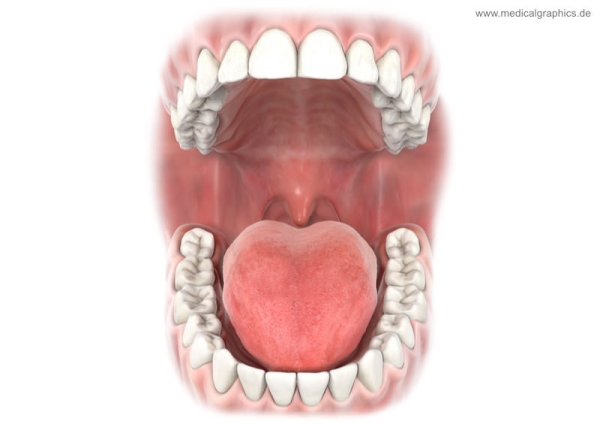 Geöffneter Mund mit Ober- und Unterkiefer, Zähnen, Zunge, Gaumen.