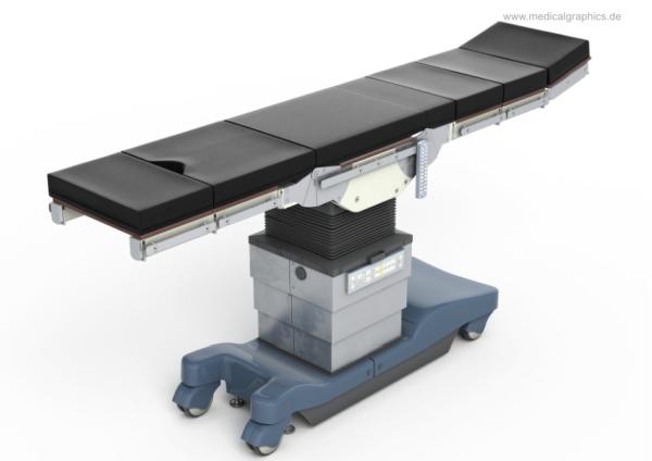 Illustration eines mobilen Operationstisches mit beweglichen und austauschbaren Elementen zur optimalen Lagerung des Patienten bei einem chirurgischen Eingriff.