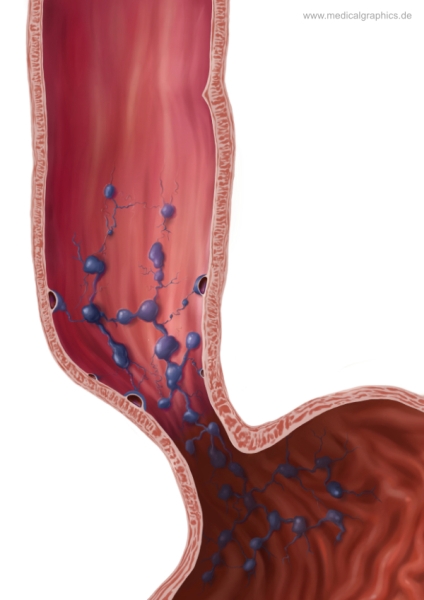 Illustration von Krampfadern (Varizen) in der Speiseröhre (Ösophagus). Hierbei sind die Venen in der Wand der Speiseröhre erweitert. Auslöser ist eine gestörte venöse Blutzirkulation, die Folge einer Leberzirrhose sein kann.