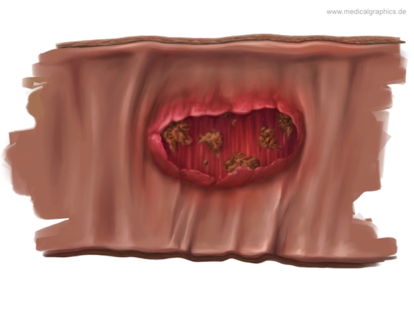 Illustration geschwollener, entzündeter Peyer-Plaques während einer Durchfallerkrankung (Diarrhö). Diese kann z. B. durch Typhus oder Darmtuberkulose ausgelöst werden. Die Erkrankung ist hier fortgeschritten, im Ulkusgrund ist die Muskularis sichtbar.