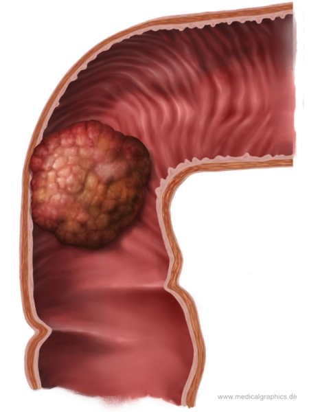 Illustration eines polypösen Adenokarzinom im Übergang vom Colon sigmoideum (Sigma) ins Rektum.