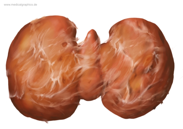 Illustration der Riedel-Struma, oder auch Riedel-Thyreoiditis oder „eisenharte Struma“ genannt. Hierbei handelt es sich um eine seltene die Schilddrüse verhärtende Entzündung.