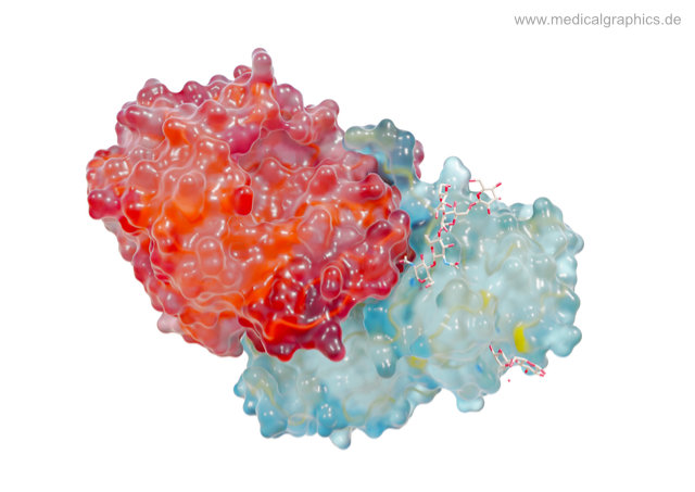 Illustration eines Rizin Proteins als gläsernes Oberflächenmodell mit angedeuteten, tieferliegenden Bändermodell auf weißem Hintergrund. Rizin ist ein hochgiftiges Protein aus den Samen des Wunderbaums. Es hemmt in der Zelle die Proteinbiosynthese und bringt diese dadurch zum Absterben. Die Illustration basiert auf Strukturdaten von Rutenber, E., Katzin, B.J., Montfort, W., Villafranca, J.E., Ernst, S.R., Collins, E.J., Mlsna, D., Monzingo, A.F., Ready, M.P., Robertus, J.D.