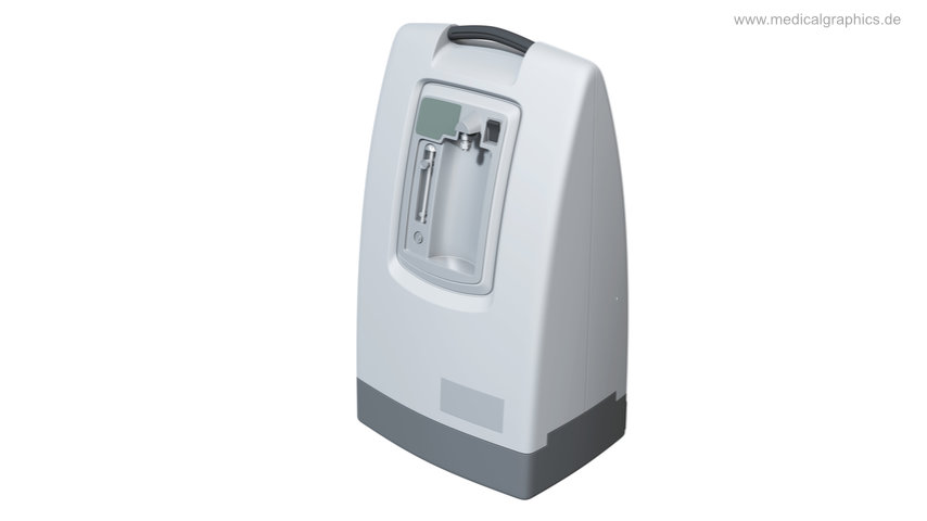 Illustration eines Sauerstoffkonzentrators zur Versorgung von Patienten zur Langzeit-Sauerstofftherapie (LTOT). Bei dieser Behandlung wird Patienten mit chronischem Sauerstoffmangel im arteriellen Blut (Hypoxämie) durch das Gerät dauerhaft Sauerstoff zugeführt.