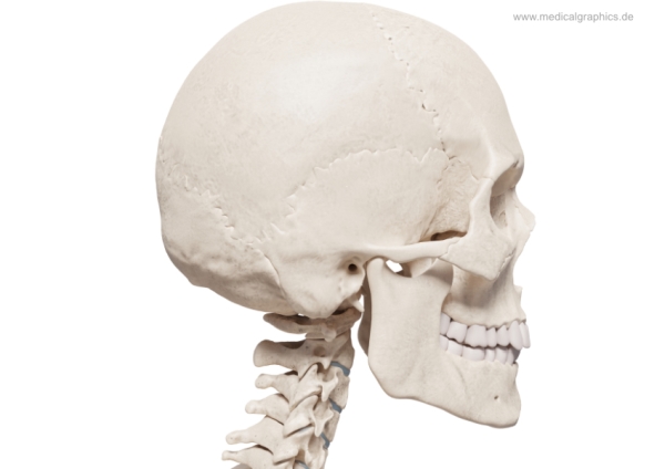 Illustration des Schädels mit Halswirbelsäule von lateral (rechts).